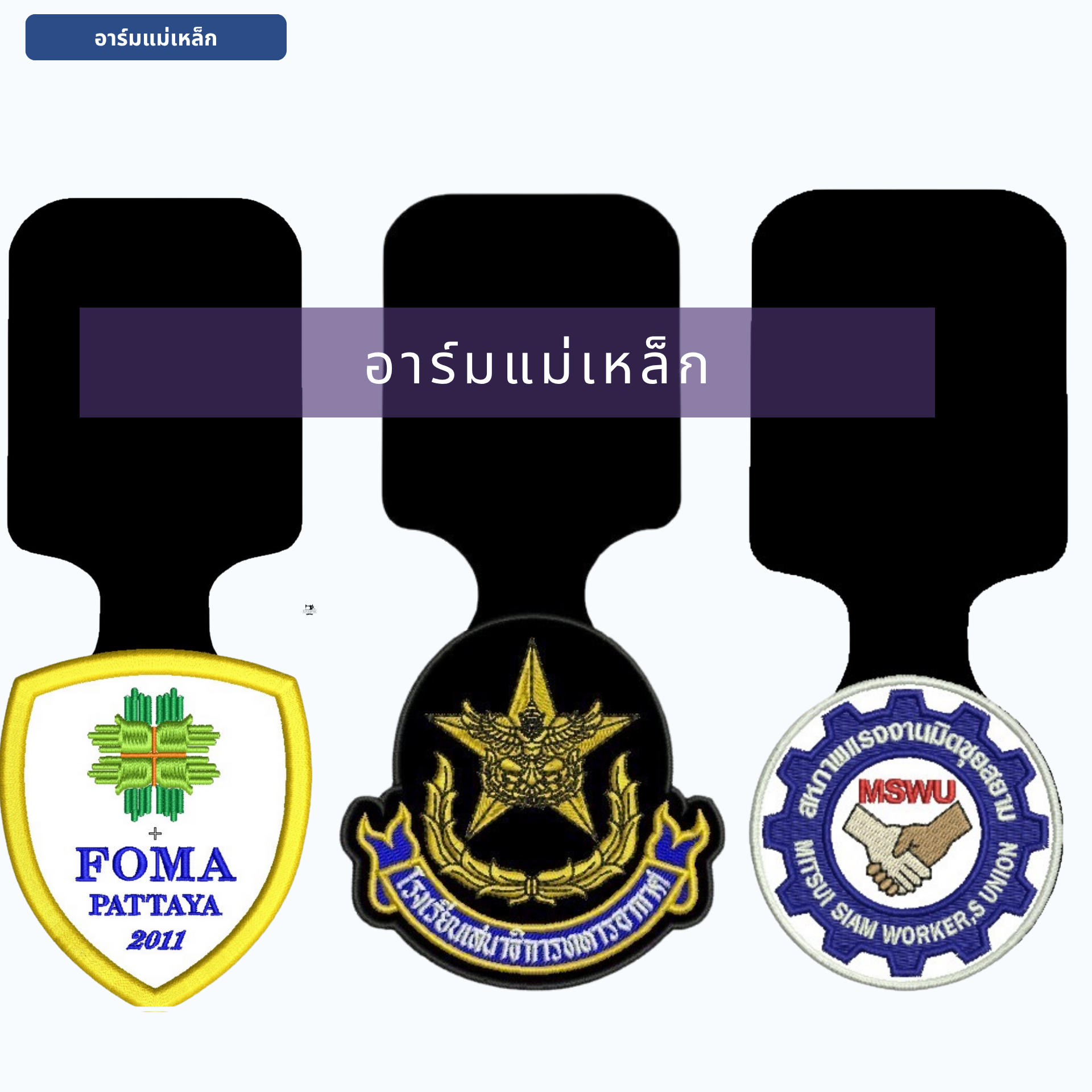 อาร์มแม่เหล็กคือระบบการยึดติดที่ใช้แม่เหล็กแรงสูงสองชิ้นคีบผ้าเสื้อสูทจากสองด้าน โดยไม่ต้องใช้เข็มแทงทะลุผ้าเลย ด้านหนึ่งจะเป็นส่วนหน้าที่มีตัวโลโก้ ชื่อ หรือเครื่องหมาย ส่วนอีกด้านจะเป็นแผ่นแม่เหล็กรองรับด้านในเสื้อ เมื่อนำมาประกบกัน แรงแม่เหล็กจะช่วยยึดให้แน่นหนา ไม่หลุด แต่ก็ถอดออกได้ง่ายเมื่อต้องการ